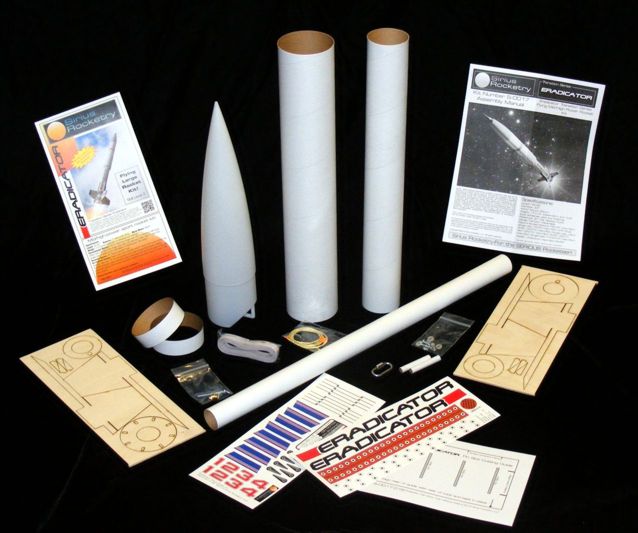As usual the Sirius Rocketry Eradicator contains LOTS of high-quality full-color waterslide decals to make it yet another beautiful Sirius Rocketry kit that is fun to build, display, and fly! The Eradicator features: - Heavy-wall body tubes to stand up to the rigors of higher-impulse flight. - Precision laser-cut aircraft plywood fins and centering rings. - Durable 30" ripstop nylon parachute from our friends at Top Flight Recovery. - Durable 400-pound test Kevlar shock cord mount and generous elastic shock cord to soften the stress of deployment. - A detailed 12-page instruction manual that Sirius Rocketry is famous for. It includes clear step-by-step illustrations and several pages of suggestions and tips to help you make the most of your build. Our instruction manuals are based on 40 years of rocketry experience, and users rave about the things they learn about building great models from the tips in our manuals. - Many extras are also included so you do not have to purchase them seperately or modify the kit. Like a quick link for the parachute and positive motor retention hardware. These are just some of the things that are optional in other kits. Both a 1/4" launch lug and rail buttons for standard 1010 rail are also included to give you the ability to launch on almost any club's equipment. Now, anyone who knows us knows that we like them to go up low and slow and not so high that we cannot enjoy the whole flight. But if you want, the Eradicator can go out of sight. The range of altitiudes on recommended motors are listed in the right column. Sirius Rocketry