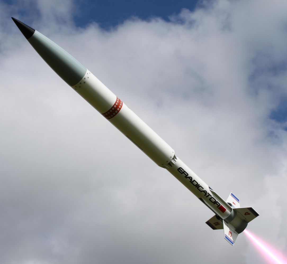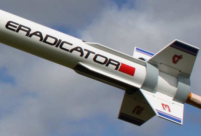 EradicatorProd # S-0017 Transition SeriesMilitary/Sounding Rocket-Styled Mid/High Power RocketThe Eradicator is the latest addition to our Transition Series line of kits. Transition Series kits are large rockets that can be flown on model rocket motors, yet can also be flown on high-power motors to help the user transition into high-power rocketry. (See the first kit in our transition series here, the Interrogator G)! The Eradicator flies on F and G motors, and plenty high too. And when you are ready to try for your Level 1 high-power certification, the Eradicator can comfortably fly even higher on an H motor in its 29mm motor mount and return safely with its light, yet rugged construction on a 30" ripstop Nylon chute!