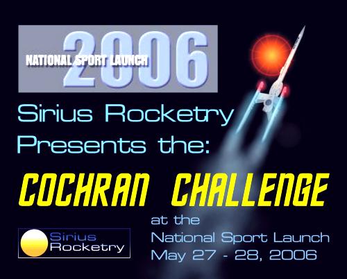Sirius Rocketry, fresh back from one national event (NARCON 2006, report and pictures below) is sponsoring another event this year, at the National Sport Launch, which happens Memorial Day weekend, May 27th and 28th, 2006, and is hosted by the Dallas Area Rocket Society (DARS). Sirius Rocketry is sponsoring one of the fun events (since it fits right in with the theme of our Refit U.S.S. Atlantis), the Cochran Challenge. In what sounds like some typical "Texas-sized" fun, the Cochran Challenge has one simple goal. Slam as big an engine as possible in your rocket and let her rip at "Warp Speeds!"