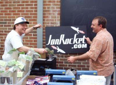 To end a sort of ongoing joke on the Rocketry Forum where I kidnapped, er, kept the JonRocket sign for safekeeping when John left NARCON last year (forgetting his sign), John (not Jon) Arthur (right) of JonRocket.com finally gets his sign back alive for an undisclosed sum of unmarked bills.