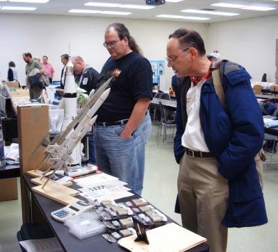Ric Gaff and Mark Bundick look over the Sirius Rocketry kit line at the Sirius booth.